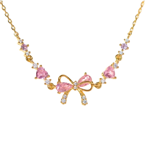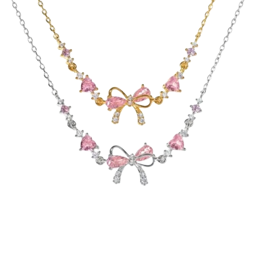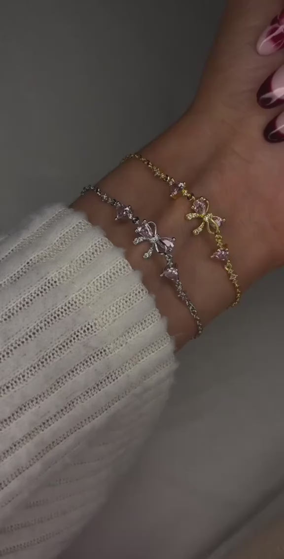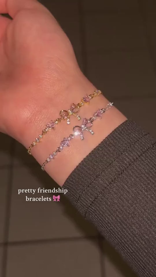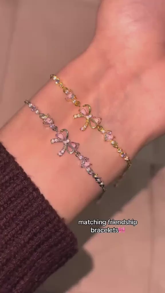 Ces deux bracelets assortis dévoilent un design délicat, illuminé par des cristaux roses en forme de cœur et un nœud raffiné au centre. ✨